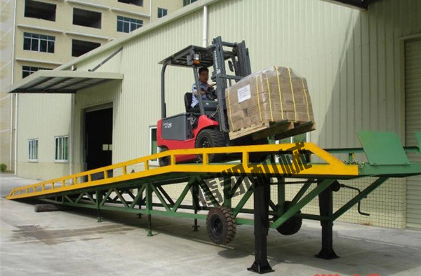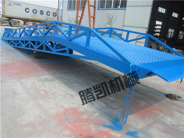 移动式登车桥是与叉车配合使用的货物装卸辅助设备,根据汽车车厢的高低调节高度,叉车可以直接通过本设备驶入车厢内部进行货物的批量装卸,仅需单人作业,即可实现货物的快速装卸。它使企业减少大量劳力,提高工作效率,获取更大经济效益。