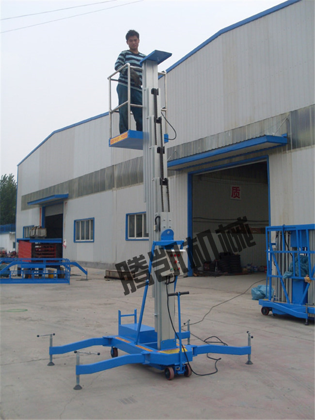 单柱铝合金升降机升降动力分为220V、 380V,或电瓶动力源,特殊环境也可采用防爆泵站及防爆电器。升高4——10米,载重100-150公斤。主体采用高强度优质铝合金材料,具有造型美观、体积小、重量轻、升降平稳、安全可靠等优点。